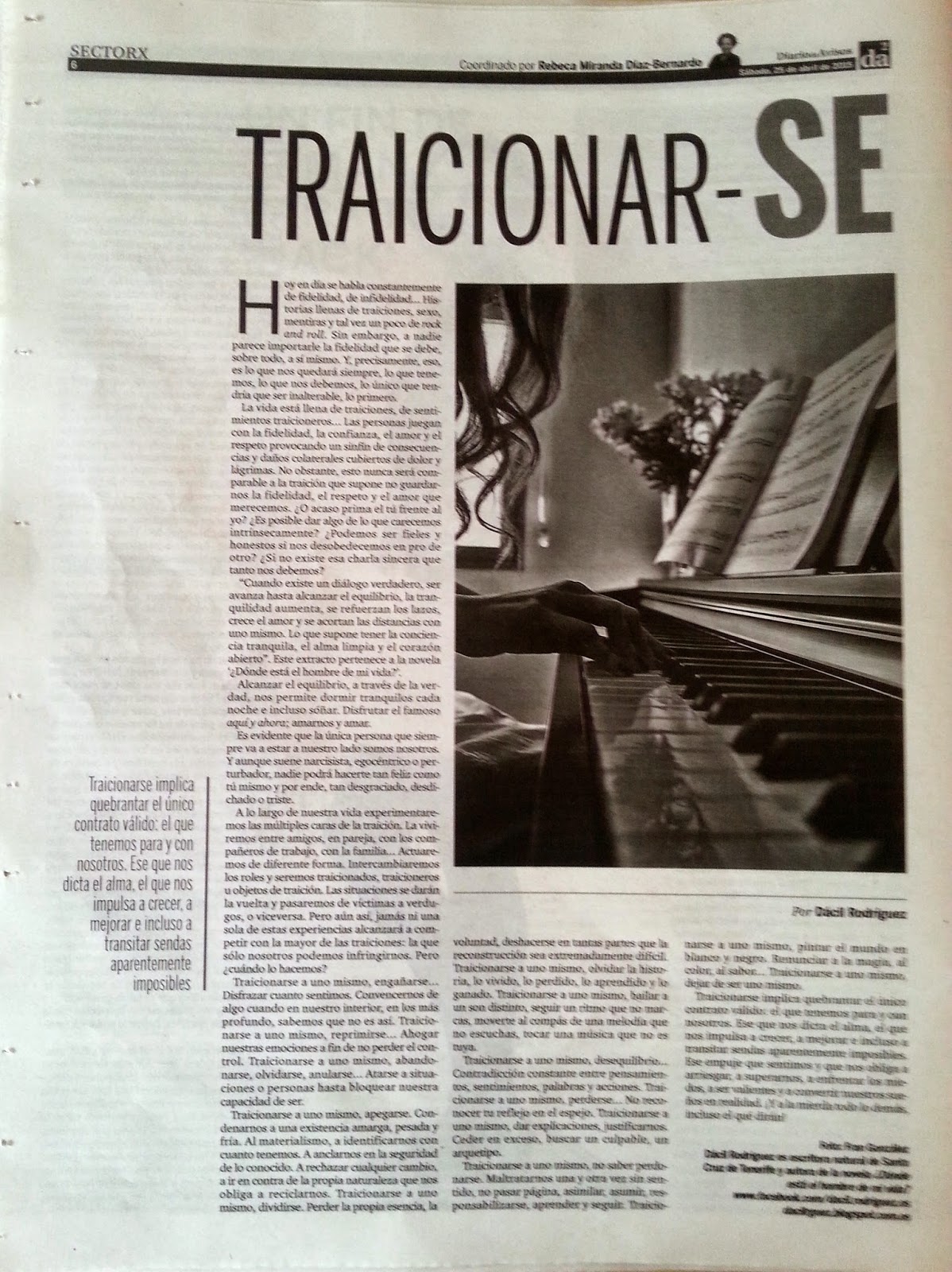 Traicionarse implica quebrantar el único contrato válido: el que tenemos para y con nosotros. Ese que nos dicta el alma, el que nos impulsa a crecer, a mejorar e incluso a transitar sendas aparentemente imposibles. Ese empuje que sentimos y que nos obliga a arriesgar, a superarnos, a enfrentar los miedos, a ser valientes y a convertir nuestros sueños en realidad. ¡Y a la mierda todo lo demás incluso el qué dirán!